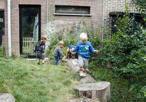 Het is een groene oase, waar onze kinderen met natuurlijke materialen kunnen spelen. Het is een natuurlijke tuin waarin de natuur samen met de kindjes speelt. Ze kunnen bergen beklimmen, in het zand graven, in de schors duiken, tussen kasteelmuren spelen,.... Rusten kan gebeuren in de wilgen hut onder een groen dak.